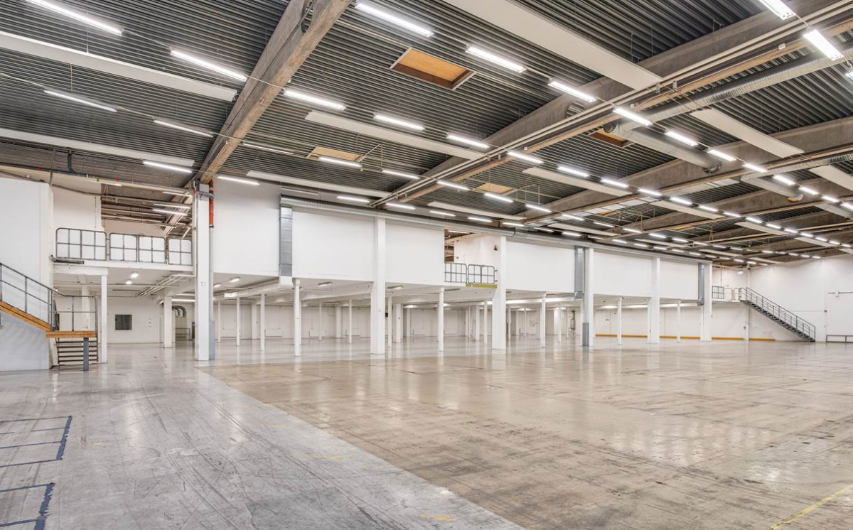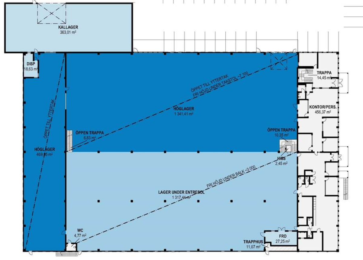 Lagret är ca 4800 kvm med fri takhöjd upp till dryga 7 meter.