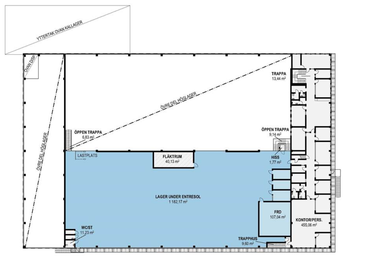 Golvbörighet: 3 ton/kvm i lagerdelen, 400 kg/kvm på entresolplan och 1 ton/kvm under entresol.