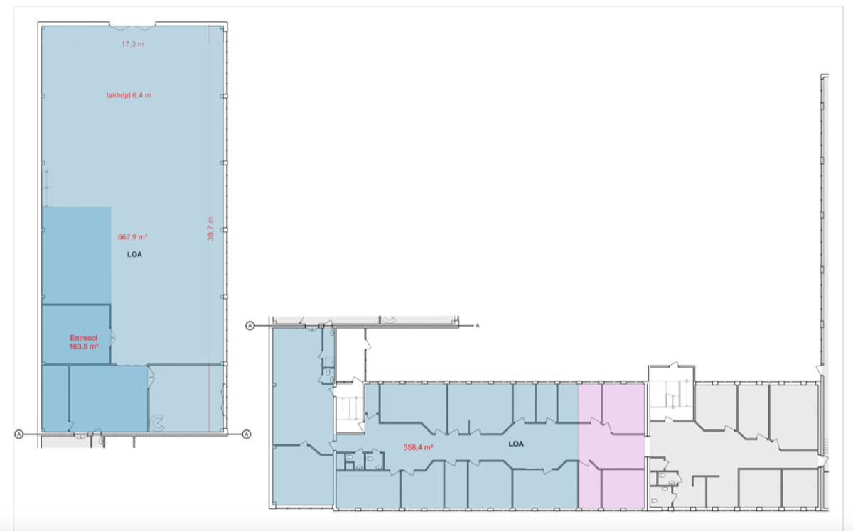 Den generösa lagerdelen har en takhöjd på cirka 6,5 meter under balk, och porten mäter omkring 6 meter i både höjd och bredd. Ett entresolplan finns i dag installerat, men kan enkelt tas bort för att utnyttja hela takhöjden vid behov. En travers på 10 ton finns också.