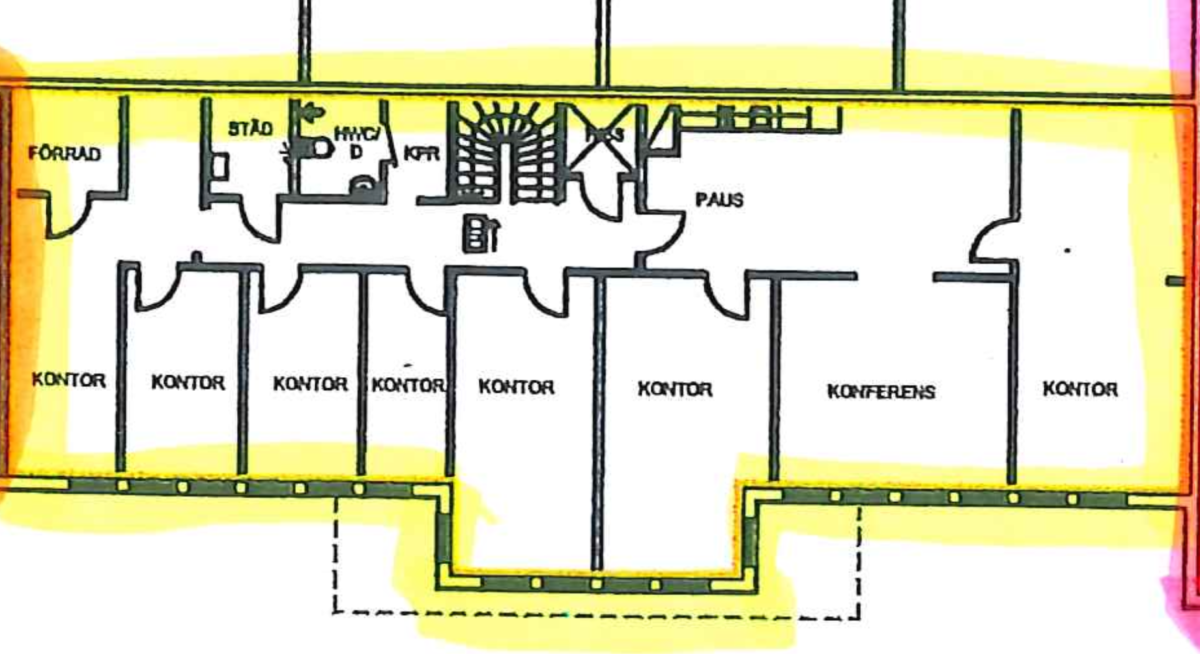 En rumsindelad lokal med plats för många. Vill man öppna upp för större landskap är det fullt möjligt. Om man dessutom behöver växa ytterligare finns en liknande kontorsyta vägg-i-vägg som är 233 kvm vilket tillsamman bildar en stor enhet om ca 450 kvm.