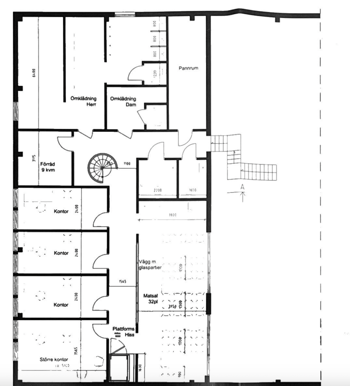A: ca 1000 kvm lager/industri med tillhörande 2 x 500 kvm kontor i två plan. Här finns kontorsrum, kök och lunchrum, konferensrum med utgång till en liten terrass, omklädning, duschar m.m. Tre portar varav en under skärmtak.